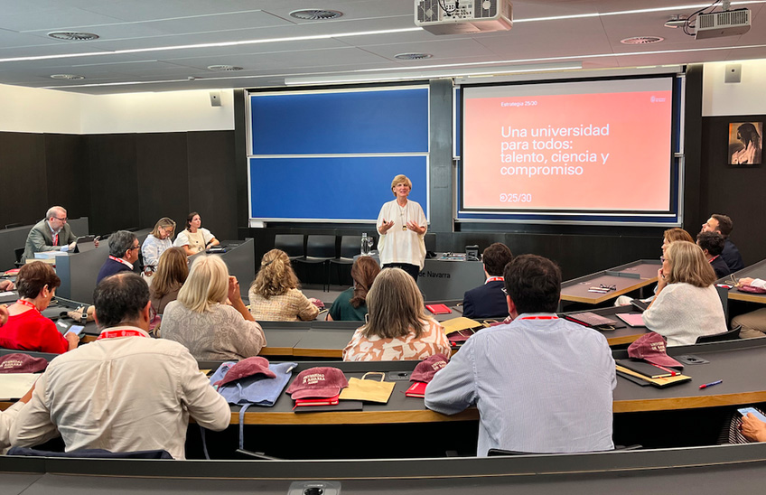 Eguneko programan, María Iraburu errektoreak eman zuen saioa, eta honek 25/30 Estrategia aurkeztu zuen, hurrengo bost urteetarako esparru gisa balioko duena. "Guztiontzako unibertsitatea: Talentua, Zientzia eta Konpromisoa" lelopean, helburua "gizarte gutxiago polarizatua eta hausnarkorragoa" eraikitzen laguntzea da. Errektoreak "konpromisoa" azpimarratu zuen, non "lider izan" nahi den eta "gizarte-eragin berezia" izan nahi duen. María Iraburuk konpromiso hori gizartera eramatearen garrantzia azpimarratu zuen, eta horretarako "Unibertsitateak bere ikasle ohien laguntza ere badu".